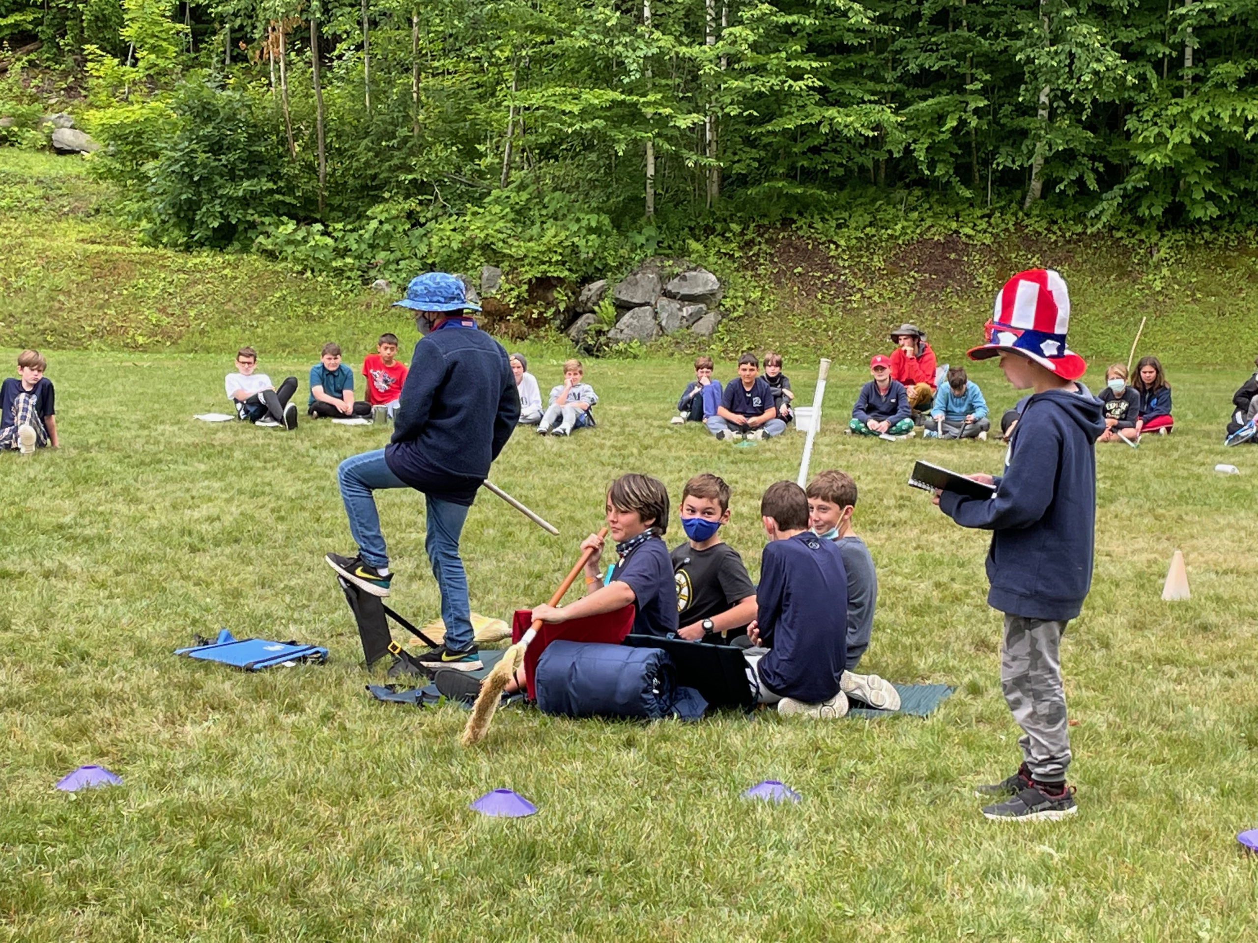 The next, big, spectator-friendly switch came in 2017, when a July 1 flood temporarily took out the normal parade route and the event was moved to the Junior soccer field, where a rural equivalent of The Globe was constructed for the various acts. Necessity that year was deemed to be a virtue, and the Pee-rade has been held there ever since. This year’s winners? In the Junior Division, the Lower Juniors (cabins 1-3) with “The Sales Pitch” (touting Pemi in a fake infomercial hawking vacation cabins without heat, screens, or hot tubs); in the Lowers, a tie between L3 (“The Unwritten History of the Pemi Valley,” which ended with the revisionist union of European settlers and indigenous bands in one, big, happy Pemi family) and L7 (whose “Study of American History” somehow involved learned lecturer Benji Edelson having pitchers of water dumped on his head three separate times); in the Uppers, U3 (with “Pemi Moore,” featuring Nick Paris dressed as our beloved director singlehandedly saving Pemi from personified corona viruses); and Lake Tent (wittily reflecting on some of our recent DEI reconsideration of selected mess hall songs by wordlessly humming “Mabel” only to launch into a lusty rendition of “Over There,” lyrics and all!) Kudos to all for their imaginative efforts on the nation’s birthday.