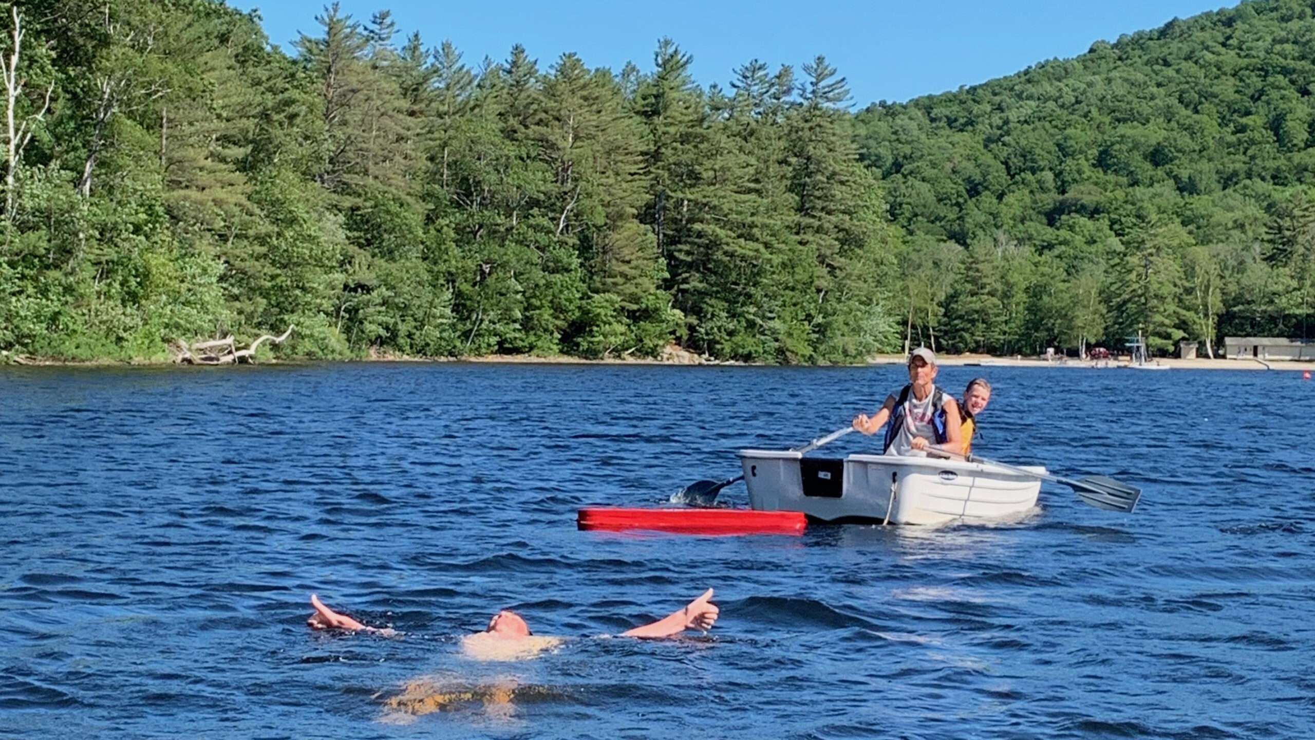 Pemi’s Distance Swim is an open-water lake swim that is approximately a third of a mile long. Boys typically swim their Distance in pairs with a cabinmate or other friend. Starting on Senior Beach, the first swimmer departs swimming unassisted to the Distance Swim Float, which sits just off shore on the north side of Lower Baker Pond. The supervising counselor rows a boat to keep watch as a second camper awaits his turn. After reaching the float, the campers switch positions and the second swimmer begins the trek back to Senior Beach.