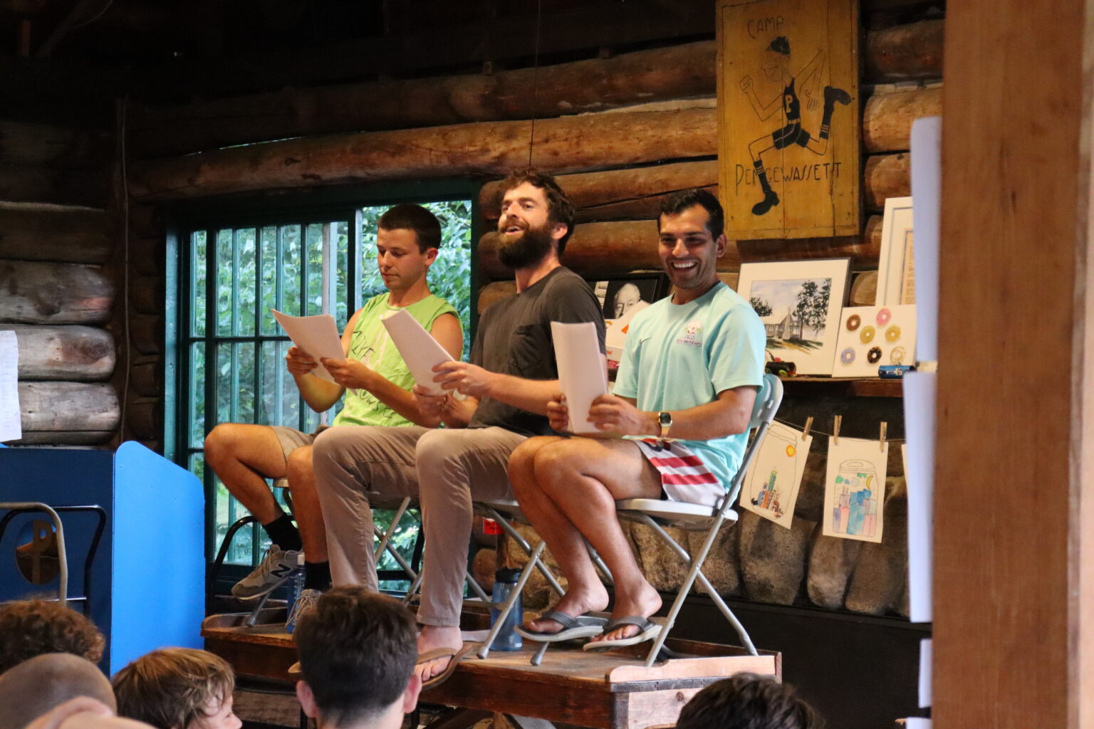 Bean Soup takes place on Monday nights in the Senior Lodge, when we all gather together to hear the week’s awards (more on these below) and articles. Presenting The Soup are the editors, who sit in the front of the room, perched on a table, looking down on their captive audience. The editors are veteran counselors or staff who take on the responsibility of writing a large amount of the content we hear. After having their ear to the ground throughout the week, they retreat to a secret location – they often claim it’s a lair on the bottom of Lower Baker Pond, but we have yet to confirm this – to write their own material and sift through the articles that campers and staff have submitted. By 7:15pm Monday evening, they’ve emerged and made their way to the Lodge where they’re greeted with a crescendo of chants and cheers to usher them on stage.